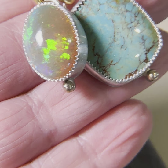 This exceptional Kingman turquoise cab swirls with green, blue and caramel veining, is paired with a dark base Welo opal. The opal doesn’t disappoint with its amazing green, blue, gold and orange rolling flash. Both are set in fine and sterling silver with 18k gold accents. 20” gold vermeil rolo chain.